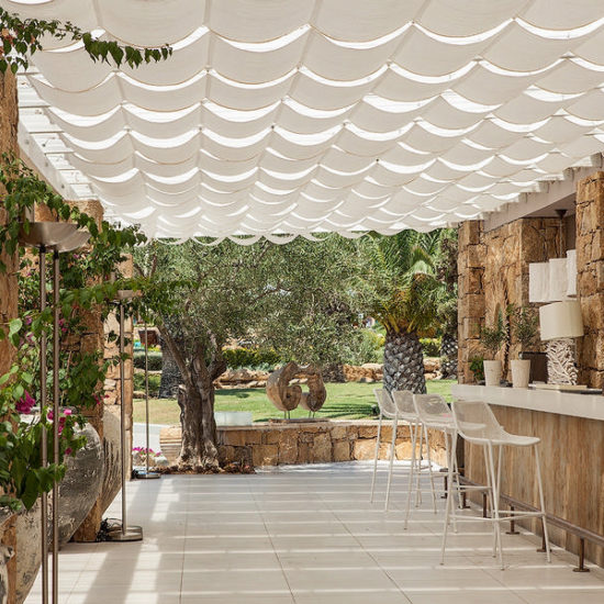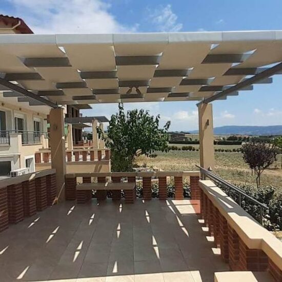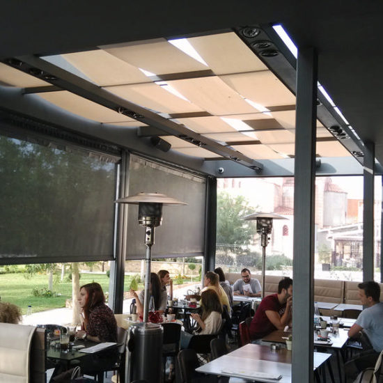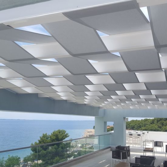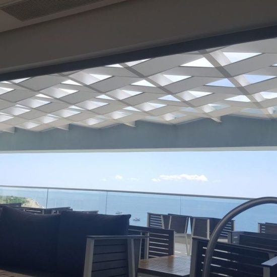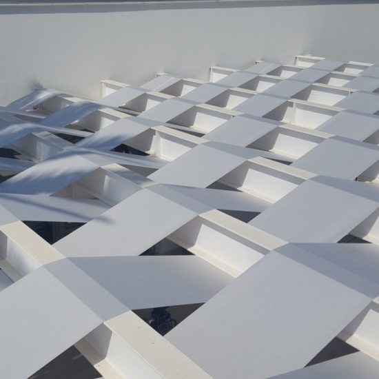 This particular pergola belongs to the braided pergolas, where the material is alternately braided between the pergolas, making a very nice stylistic proposal. The material can be anything. From block out, imported acrylic or imported perforated.